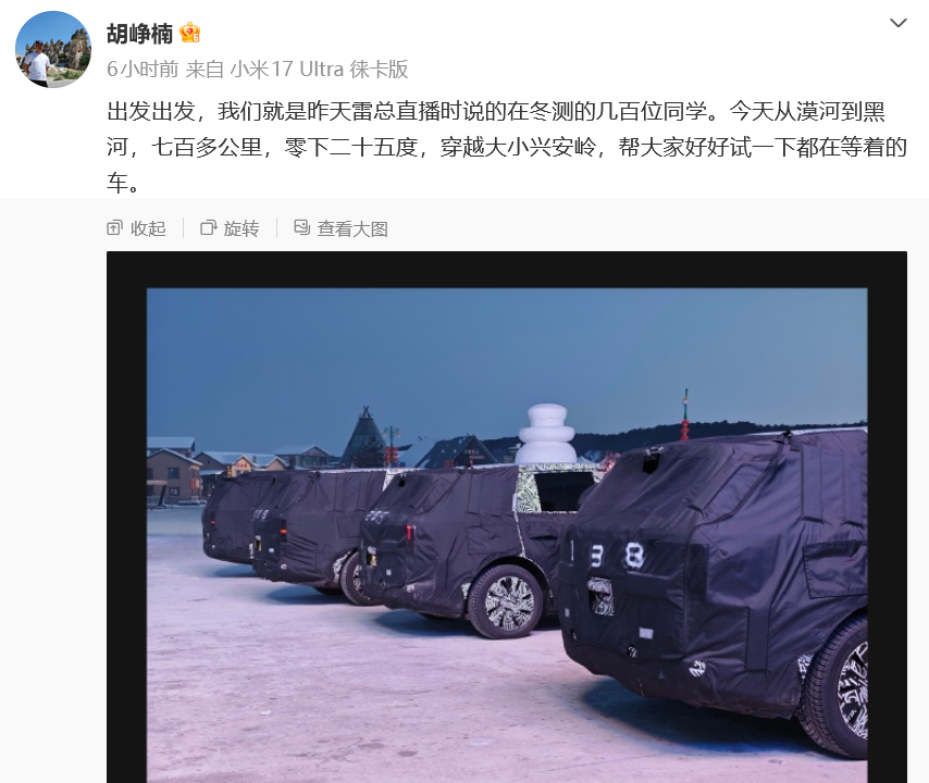 小米从吉利研究院挖来的院长、小米汽车的“关键先生”——胡峥楠,刚发微博晒出了一组伪装测试车的冬测图。